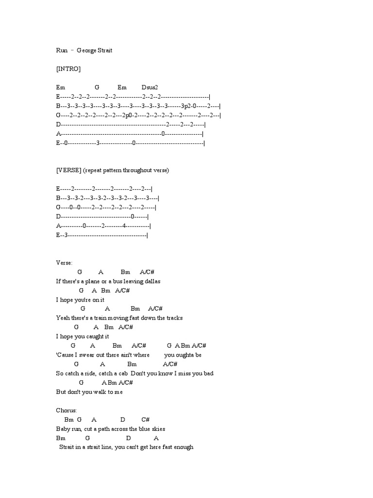 Lean on the gas and off the clutch. G A Bm AC If theres a plane or a bus leaving dallas G A Bm AC I hope youre on it G A Bm AC Yeah theres a train moving fast down the tracks G A Bm AC I hope you caught it Cause I swear out there aint where you oughta be So catch a ride catch a cab Dont you know I miss you bad But dont you walk to me Chorus. Add to Favorites More colors Strait Texan Koozie PrettyPeaByIsabella 200. George Strait - Run Intro. Accordi di Baby Run George Strait impara gratis a suonare lo spartito. Cómo tocar Baby Run en la guitarra. You cant get here fast enough. Letra tradução e música de Run George Strait cover de Taylor Swift - Baby corra Corte caminho pelo céu azul Direto numa linha reta Você não consegue chegar aqui rápido o bastante. Chords ratings diagrams and lyrics.